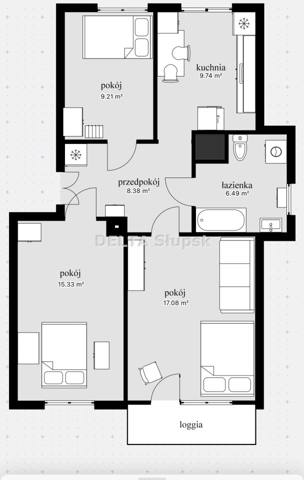 | Powierzchnia pokoi | 17,1+15,3+9,2 m2 |